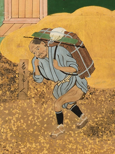 魚売り。江戸時代には棒手振と言い天秤(てんびん)棒の両端に、商品の入った箱や籠を吊り下げ、棒を肩に担ぎ魚・野菜など食材や食器、日用品を売り歩く商売に司る人が多かった。
